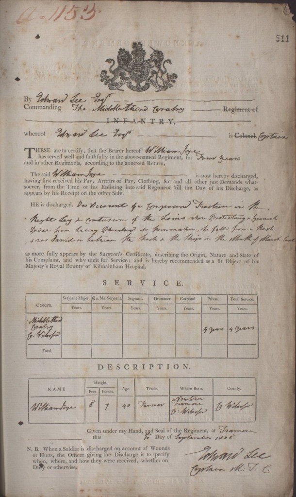 Edward Lee of Tramore Lodge was captain of the Middlethird Cavalry at the time, when one of his men, William Joye, a farmer from Newtown, was injured in the incident. William, aged 40, stood 5ft 7” tall. He was discharged on account of a compound fracture in the right leg & contusion of the loins when protecting a Spanish prize from being plundered at Bonmahon, fell from a rock and was jammed in between the rock and the ship in the month of March last. The discharge was witnessed by Lee on 10 September 1805. 15
