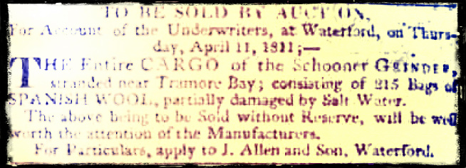 23. The Grinder, February 1811. The Grinder, Master William Robinson was stranded in the bay on 17 February while on a journey from Lisbon for Plymouth.38She was a single decked schooner, 86 tons burden, with a draught of water of 9 ft., American built in 1786 and owned by Forrester. She was a regular trader between London and Viana do Castelo in Portugal. Her entire cargo consisting of 250 bags of Spanish wool, partially damaged by salt water, was auctioned at Waterford, on Thursday, April 11.39
