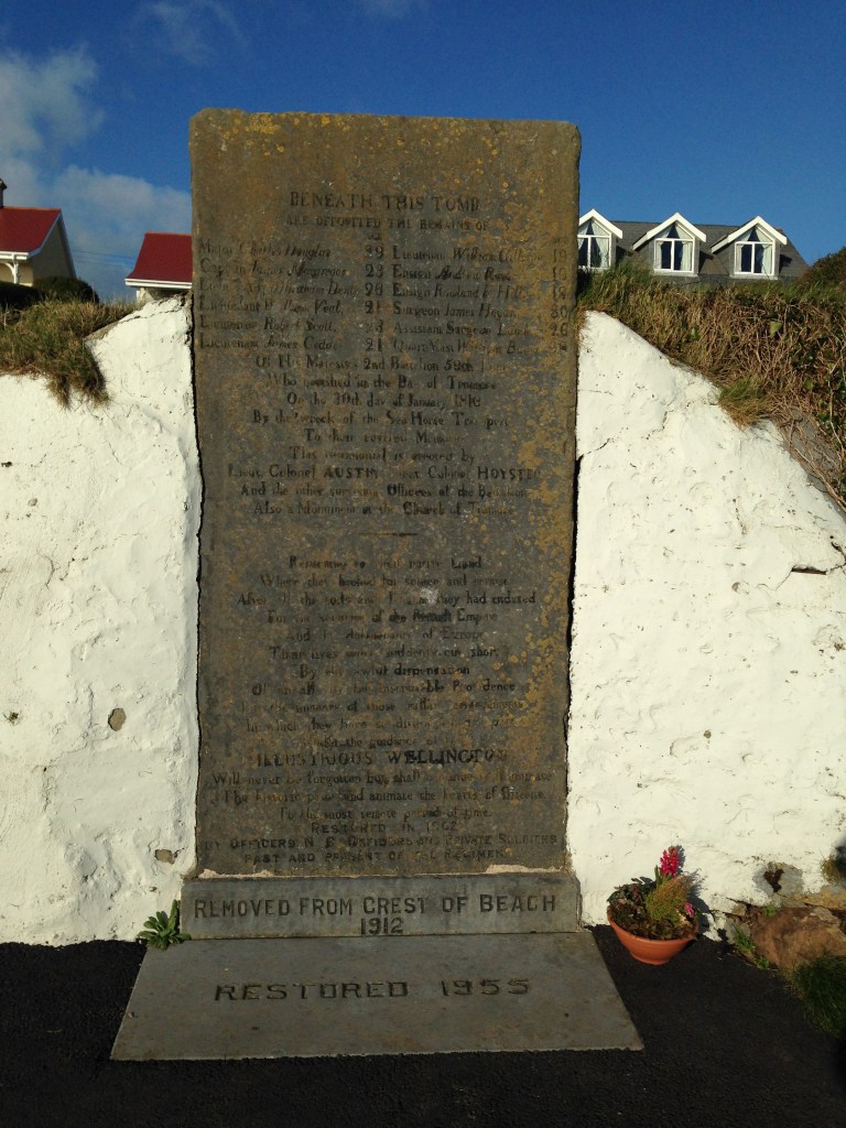 Captain White was aged 43 at the time of the wreck. He was buried in Drumcannon graveyard, the funeral service being performed by Reverend John Cooke on 22 January. The burials of the other victims were not recorded in the Drumcannon parish register. Interestingly, a memorial stone was erected for Captain White in the churchyard at Stradbally, the inscription on which reads: Sacred to the Memory of Captain JAMES WHITE Master of the Ship Trusty of Bristol Wrecked on this Coast January 29th 1809. The stone includes an epitaph extolling his virtues as an affectionate and faithful husband, tender and sincere father. The stone now lies flat but appears to have been originally placed in an upright position. Considering that the inscription records an incorrect date of death, I would think that the stone was placed in Stradbally some considerable time after the event, due to an error of some sort. Who knows, perhaps it was originally intended for Tramore?