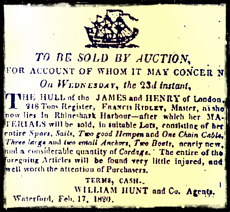 36. The James and Henry, 17 December 1819. The James and Henry, F Ridley, master, was a brig of 221 tons burden, single decked with beams, sheathed with copper over boards, with a draught of water of 14ft., built in Sunderland in 1807 and owned by its captain & Co. She held an E2 classification, a 2nd class ship, built of 2nd class materials.65 The James and Henry, of London, Ridley, from Maranham to Liverpool, was on shore at Tramore Bay, on 17inst. Crew and most of the cargo saved.66 The James and Henry, Ridley, from the Brazils to Liverpool, was on shore at Tramore Bay, on the 17inst.67